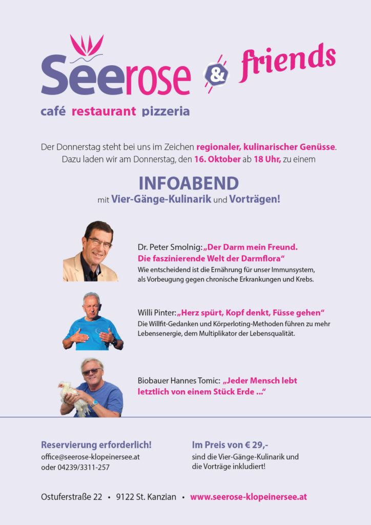 Die Veranstaltung „Seerose & friends“ bietet einen inspirierenden Infoabend mit Vorträgen und einem exklusiven Vier-Gänge-Menü, bei dem regionale, kulinarische Genüsse im Mittelpunkt stehen. Experten geben Einblicke in die Themen Darmgesundheit, Lebensenergie und nachhaltige Landwirtschaft, um Gesundheit und Lebensqualität auf ganzheitliche Weise zu fördern. Der Abend lädt zum Informieren, Genießen und gemeinsamen Austausch ein.