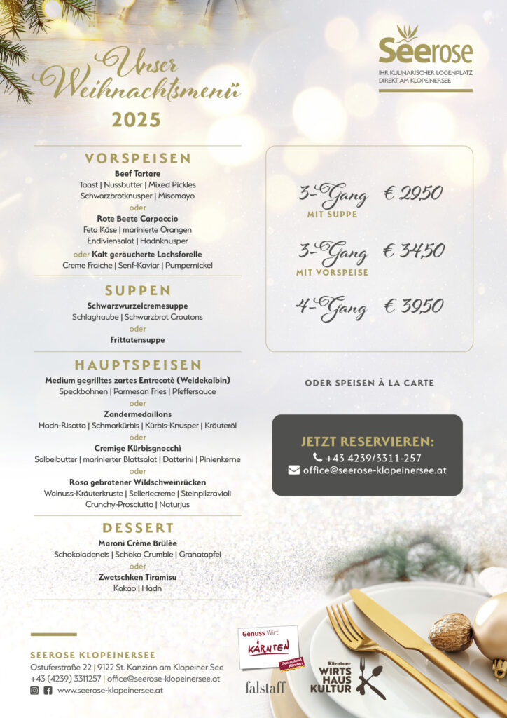 Genießen Sie unser festliches Weihnachtsmenü in stilvollem Ambiente direkt am Klopeiner See. Von kreativen Vorspeisen über regionale Hauptgerichte bis hin zu verführerischen Desserts – lassen Sie sich und Ihr Team kulinarisch verwöhnen. Jetzt Wunschtermin sichern und gemeinsam unvergessliche Stunden erleben.