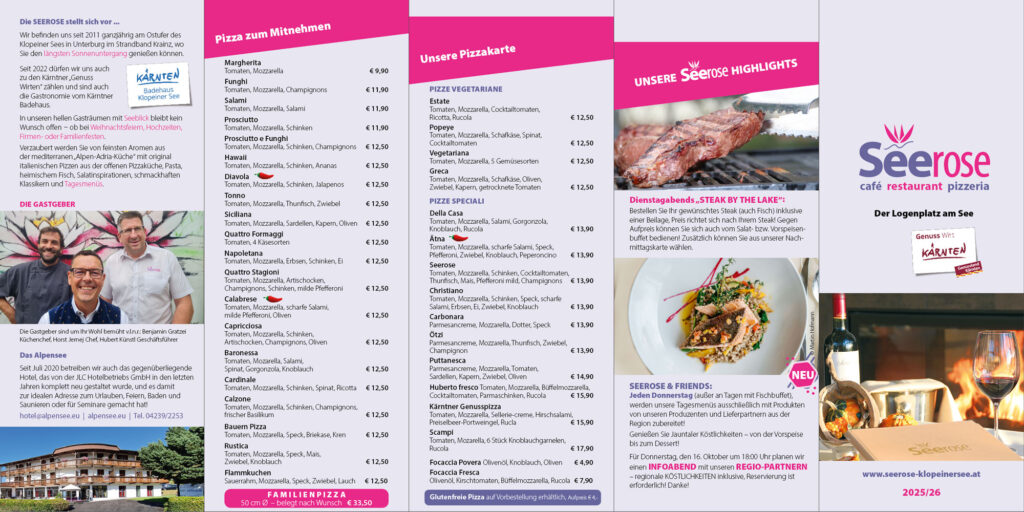 Bitte beachten Sie unsere speziellen Öffnungszeiten, Betriebsurlaube und Veranstaltungstermine – alle aktuellen Informationen finden Sie im Kalender. Wir empfehlen rechtzeitige Tischreservierung und wünschen genussvolle Stunden in der Seerose am Klopeiner See!